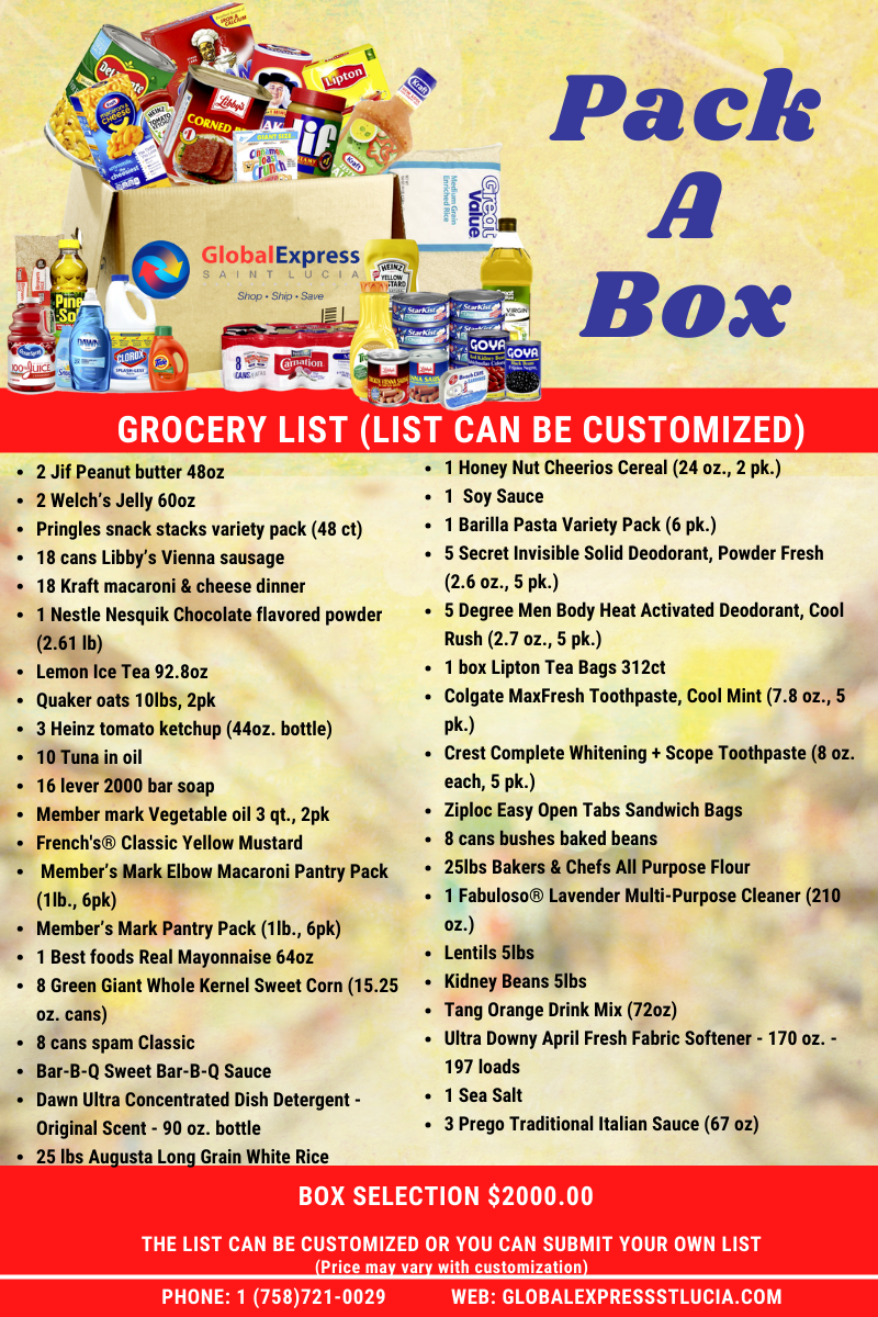 If you would like to select your own goods and create a customized order, create your list and email it to packabox@globalexpressstlucia.com